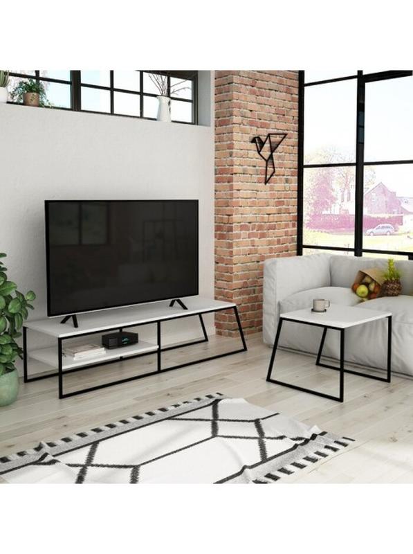 Стильний комплект у лофт-естетиці поєднує функціональну тумбу під телевізор довжиною до 163 см та компактний кавовий столик. Надійна металева конструкція (20 × 20 мм) з покриттям, що зберігає естетику навіть при активній експлуатації. Тумба обладнана трьома відкритими полицями — одна широка для техніки чи декору та дві додаткові для організації простору; вони виготовлені з ламінованого ДСП 16 мм, стійкого до вологи та простого в догляді. Загальні розміри: тумба — 550×1630×450 мм (17 кг), столик — 600×570×500 мм (10 кг). Лаконічний білий дизайн легко інтегрується у сучасні або мінімалістичні інтер’єри. Власне виробництво ТМ МСМ.