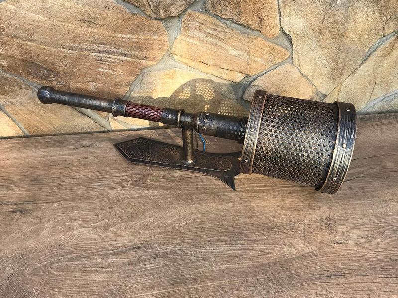 Настінний світильник може бути незвичайним світильником, а шедевром, який може прикрасити ваш будинок і підкреслити особливості інтер'єру/екстер'єру вашого будинку. Ось кований настінний світильник ручної роботи у вигляді факела. Ви не знайдете нічого подібного. Це дуже декоративно! Він може служити лампою для вашої веранди чи під'їзду або лампою всередині будинку. Цей ліхтар створює середньовічну атмосферу старих вікінгів! Цей ліхтар є обов'язковим для будь-якого табору вікінгів або середньовіччя. Цей ліхтар поверне вас у старі середньовічні часи. Таким факелом вікінги освітлювали свої печери. Це унікальне доповнення до вашого табірного комплекту вікінгів! Розміри лампи: висота - 59 см діаметр факела (металева сітка) - 19 см вага нетто: 2.2 кг Колір: метал - чорний з нальотом бронзи/міді. Є електричний кабель без вилки. Цоколь лампочки E26/E27. Металева сітка бра може мати деякі відмінності від одного ліхтаря до іншого: розмір осередку та форма осередку металевої сітки бра може бути різною. різні від одного ліхтаря до іншого. Фактичні розміри вашого замовлення можуть дещо відрізнятися через ручну роботу. Гарний подарунок на річницю весілля (6-е - чавунне, 11-е - сталеве), день народження, день батька, день матері та багато інших випадки подарунків! Це може бути найкращим функціональним витвором мистецтва та прикрасою у вашому домі! Це гарне доповнення до інтер'єру будинку в стилі вікінгів! Приймаються індивідуальні замовлення (інший колір, розмір, наповнення). На основі цього металевого скульптурного ліхтаря я можу зробити будь-яке налаштування. Налаштування може бути обмежено лише вашою уявою. Я можу зробити гравіювання (назва/дата) на ручці ліхтарика.