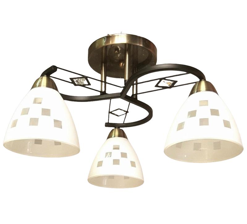 Современная и привлекательная люстра! Корпус изготовлен из металла и качественно окрашен в комбинацию цветов черный и бронза. Плафоны из прочного толстого стекла в диаметре 14см. и высотою: 11см. Патрон большой, е27. Конструкция диаметром: 45см., высота от потолка: 23см. Крепится к потолку на планку, диаметр тарелки: 15см.