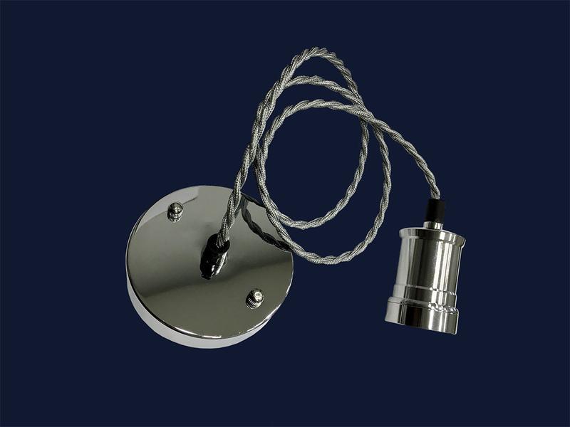 Підвіс на одну лампу в стилі LOFT Колір основи: хром Колір дроту: срібний кручений (можливий будь-який колір з нашої лінійки) Колір патрона: хром Матеріал підстави: метал Матеріал патрона: алюміній Розмір стельового кріплення: 100мм Довжина дроту: стандарт - 1 метр (можлива будь-яка довжина) Тип цоколя: Е27