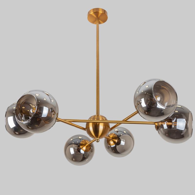 - Материал - металл, стекло - Цвет металла - бронза - Цвет стекла - графитово-прозрачный - Источников света - 6 - Цоколь патрона - Е27 - Диаметр плафона - 15см - Размер -75х20см (д/в) - Центральную трубочку можно скорректировать по длине. За счет чего регулируется высота люстры от 25 до 70см. Интернет-магазин ***************