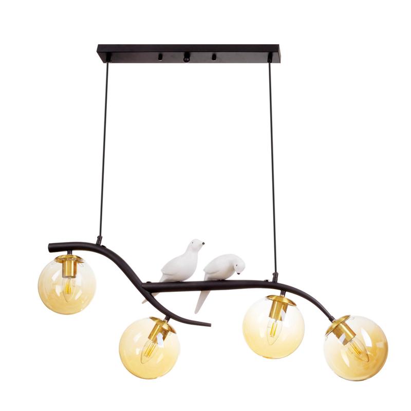 Стельова люстра на 4 лампочки BR-01 650S/4 E27 BK це сучасний світильник із сюжетним дизайном, який освітить і прикрасить кафе, ресторан, виставковий зал, тематичний магазинчик. Світильник має висоту 130 см. Його можна використовувати в житлових приміщеннях, але відповідною висотою стель. Освітлювальний пристрій схожий на гілку з бутонами, на якій сидять дві пташки. Роль бутонів відіграють злегка затемнені скляні плафони закритого типу. Корпус люстри виготовлений у чорному кольорі. Від основи відходять троси, на яких висить гілка з джерелами світла. На стелю люстру встановлюють за допомогою монтажної планки. Для роботи моделі потрібні 4 лампочки з цоколем Е27 потужністю 60 Вт. Підійдуть світлодіодні, енергоощадні лампи розжарювання.