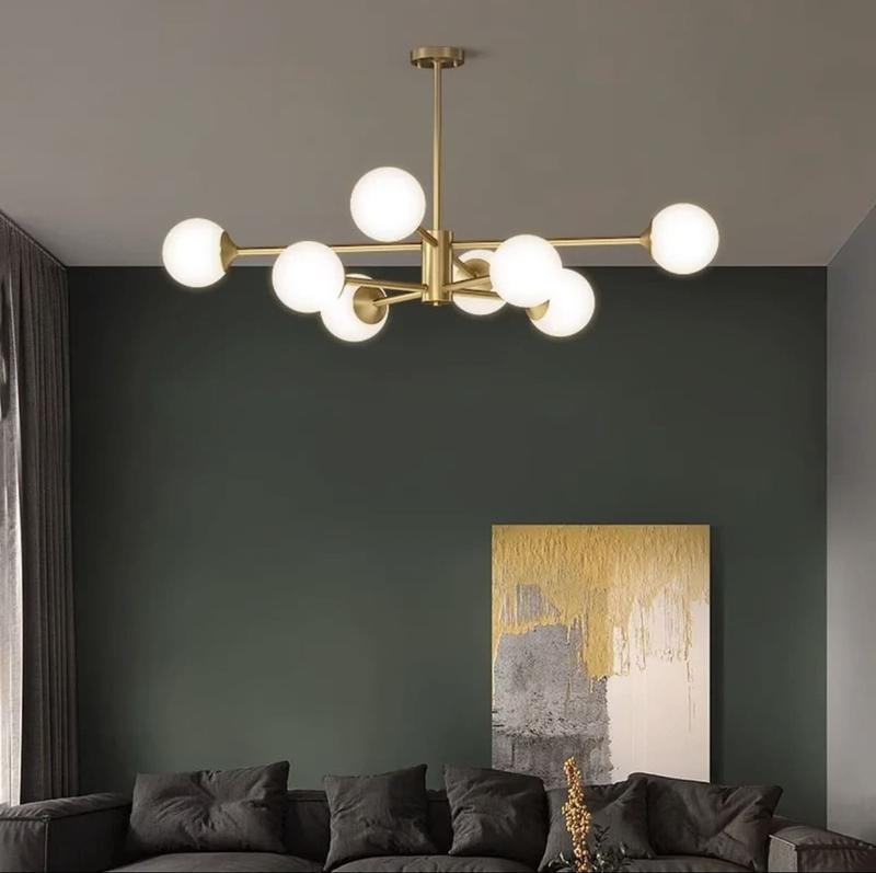 Стельова люстра Right Selection у латунному каркасі із білими матовими плафонами. Модель прдставлена на 6 та 8 плафонів.