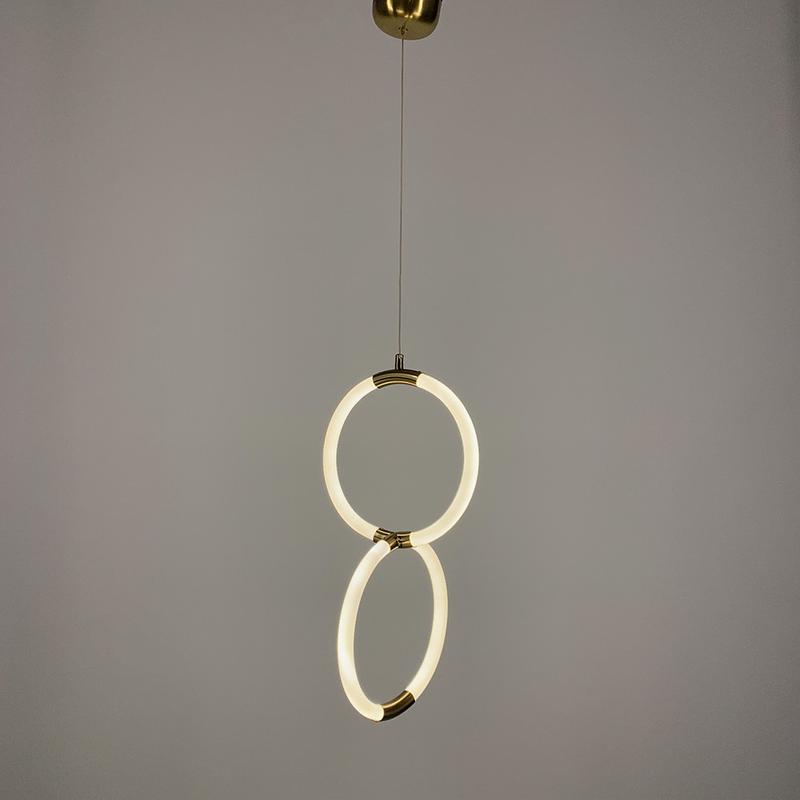Дизайн підвісу Даний підвіс складається з круглого подвійного корпусу, в якому поєднуються латунні металеві вставки та світлодіодна кругла гнучка стрічка. Завдяки своєму дизайну ця модель може бути використана як в кафе, в ресторанах, так і в будинку, в креативних просторах, шоу-румах. Дана модель представлена у корпусі двох кілець діаметром 25 см, загальною висотою корпусу 50 см.