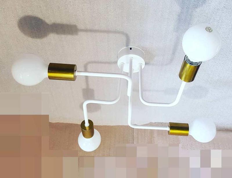 Люстра лофт із золотм, або бронзовм, або хром золотом цоколем Від виробника "СвітлоСтиль" Матеріал сталь. Калір білий,цоколь золото,або бронза, або хром-золото( при замовлені уточняйте, який вам потрібен цоколь) Ціколь Е27 Розмір 40 см х 40 см( без врахування лапм),висота 18 см. Лампи в комплект не входять! На фото не плафони, а лампочки! Порошкова фарба. Гарантія 3 роки. Висилаємо без передоплати!!!