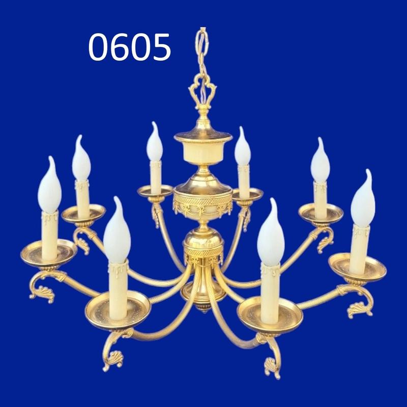 Латунная люстра на 8 ламп арт. 0605 Материал: латунь Вес: 2,3 кг Ширина: 63 см Высота: 73 см Размер патрона: Е14 Лампочки продаются отдельно