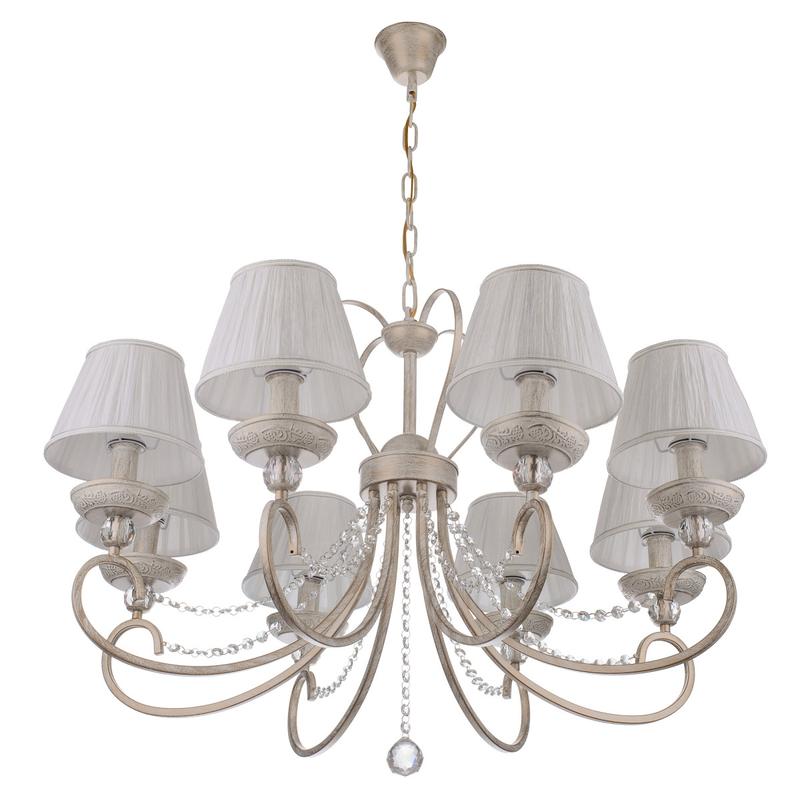Люстра в пастельних, ніжних тонах привнесе у ваш будинок атмосферу елегантності. Абажури створять додатковий затишок і дадуть м'яке світло. Люстра бежево-золотого кольору і зроблена з металу. Тканинні абажури білого кольору. Ланки ланцюга, на якій кріпиться люстра, можна додати або видалити, регулюючи тим самим висоту виробів від стелі. Для роботи освітлювального приладу потрібно 8 лампочок з цоколем E14. Підійдуть лампи будь-якого типу (розжарювання, енергозберігаючі, світлодіодні). Висота освітлювальних приладів з легкістю регулюється, її можна змінити піднявши чи опустивши ланцюг, мотузку або трос. Таким чином люстра буде висіти на більшій, або меншій висоті в залежності від ваших уподобань. Більше асортименту – в категорії Люстри, інші світильники – в розділі Освітлення, лампочки тут. Купити товар ви можете як на сайті, так і в магазинах Києва та інших міст України. На всю продукцію діє гарантія. Поради про те, як вибрати люстру читайте в статті. Висота освітлювальних приладів з легкістю регулюється, її можна змінити піднявши чи опустивши ланцюг, мотузку або трос. Таким чином люстра буде висіти на більшій, або меншій висоті в залежності від ваших уподобань.