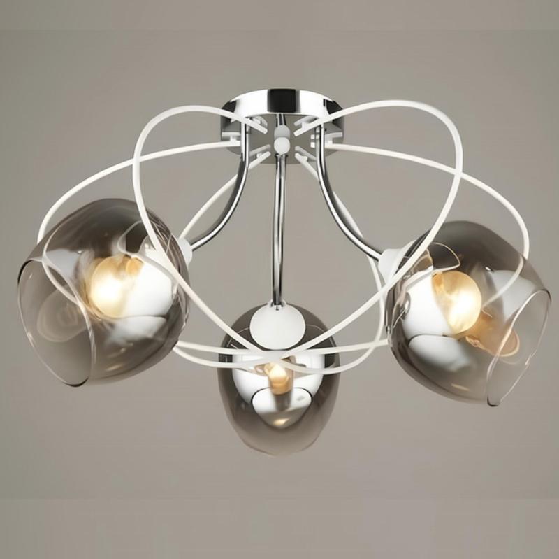 Красива, виконана в незвичайним дизайні люстра. Корпус з металу якісно пофарбований у кольори хром + білий. Діаметр її: 50см., висота від стелі: 22см. Плафони зі скла в діаметрі: 13см. Патрони великі е27. Кріпиться на планку. Діаметр стельової чаші: 12см.