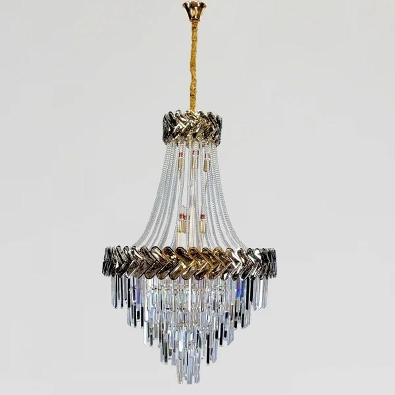 Тип джерела освітлення: E14 220V (без ламп у комплекті) Кількість джерел світла: 27 ламп Колір основи: золото Колір скла: прозорі +графіт Тип кріплення на стелю: під гачок Розмір стельової чашки: діаметр 11,5 см, висота 8 см Діаметр: 77,5 см Висота люстри: 120 см Висота максимальна: 170 см Вага: 20,5 кг Гарантія 12 місяців