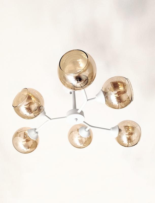 Люстра трансформер молекула в стиле лофт Материал корпуса - металл Цвет корпуса - белый Материал плафона - стекло Цвет плафона - бежевый Диаметр - 70 см Высота - 25-30 см (зависит от угла наклона плафонов) Тип патрона - E27 Количество ламп - 6 --- Отправка любой почтой