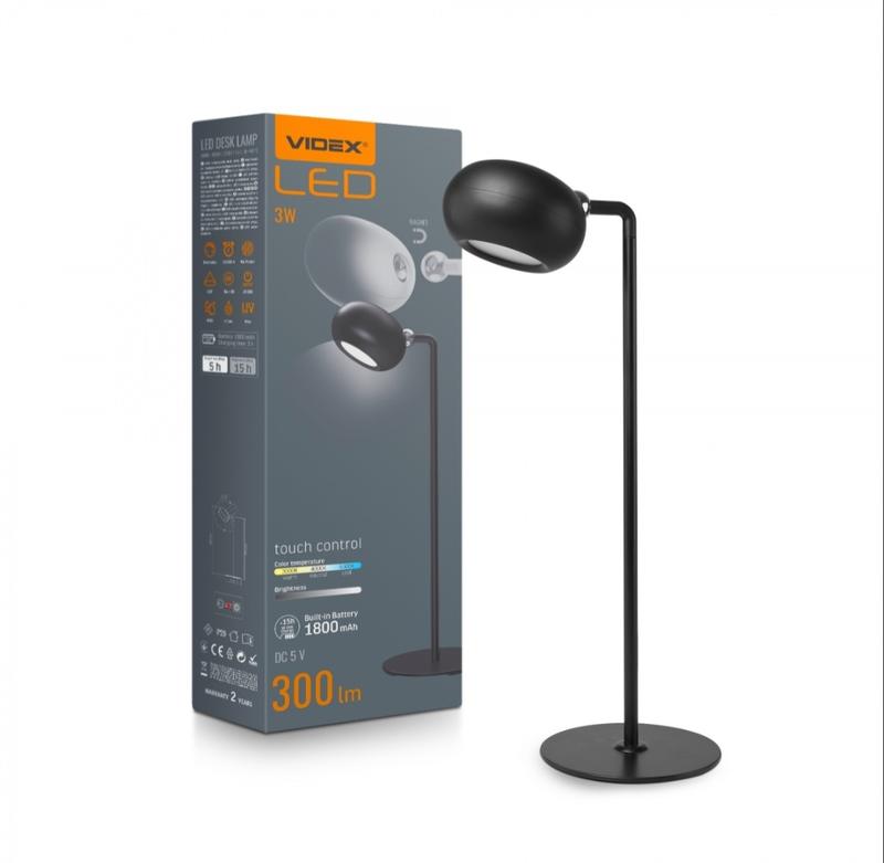 LED ЛАМПА НАСТIЛЬНА З АКУМУЛЯТОРОМ VIDEX VLE-TF18B 3W 3000-5500K ЧОРНА