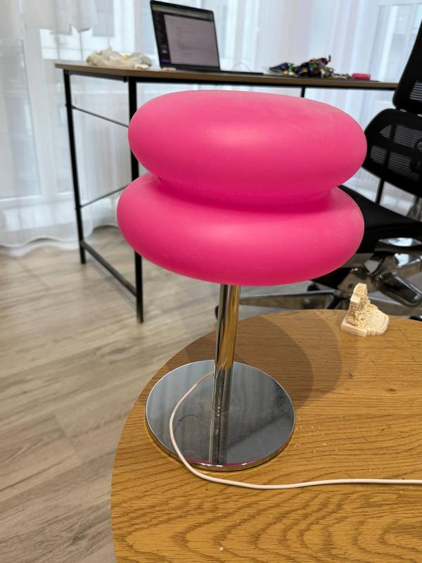 Лампа, світить рожевим, є пультик, де можна керувати відтінками рожевого, та інтенсивністю, працює від розетки