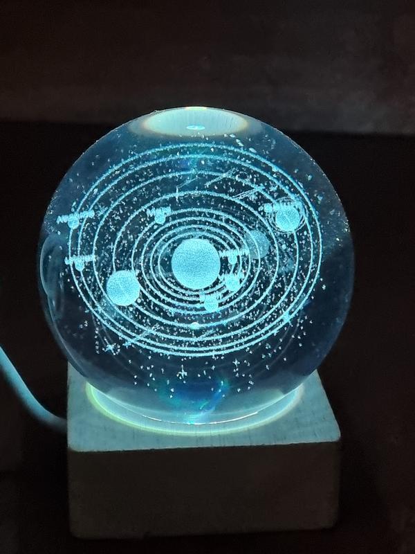 Светильник, ночник "Кришталлическая Шар" выполнена из дерева и стекла. Внутри стеклянного шара нанесена лазерная гравировка в виде Солнечной системы. Квадратная подставка со сменой цветов подсветки. 3D ночник имеет размеры: - Диаметр шара: 6 см; - Высота подставки: 2 см. Работает светильник от USB-шнура. Ночник стеклянный шар отлично подойдет для детской комнаты, спальни или кабинета. Декоративный мини светильник "Солнечная система" - отличный подарок на Николая, День Рождения, Новый Рик, новоселье: ребенку, близким людям, распорядителю, другу, коллеге по работе.