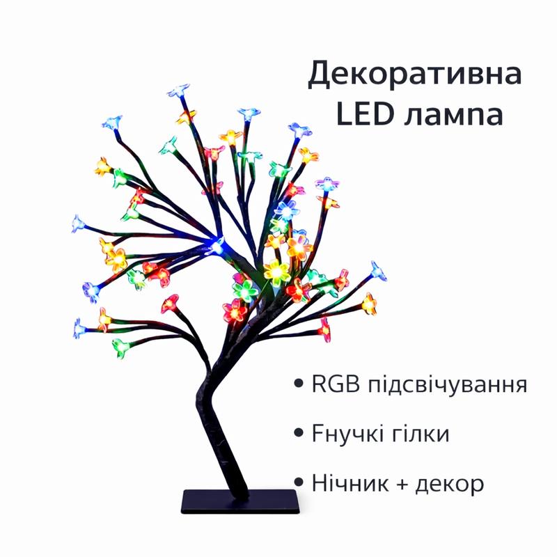 Декоративна LED лампа у формі дерева з квітами -- стильний элемент декору та м'який нічник. Гнучкі гілки дозволяють легко змінювати форму під інтер'єр. Кольорове RGB підсвічування створює затишну атмосферу в спальні, вітальні або дитячій кімнаті. Лампа стійко встановлюється на підставці та підходить для щоденного використання або як подарунок.