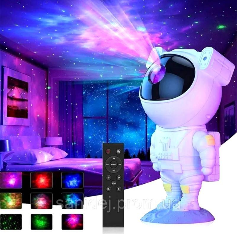 Проекционный ночник, Проектор звездного неба для взрослых, Светильник звездное небо на потолке, NST Лазерный проектор Звездного неба «Астронавт» станет замечательным ночником для юных покорителей космоса и одной из любимых игрушек! 8 разноцветных изображений туманности с регулируемой яркостью звездного неба оживят и украсят не только детскую комнату, но и вечеринку, семейный просмотр кино или игровую комнату. Яркие завораживающие изображения Галактики ночника отправят вас в удивительное путешествие в открытый космос, а разнообразие цветовых эффектов позволят в полную меру ощутить великолепие звездного неба. Лазерный проектор- ночник Космонавт - отличный подарок на День рождения или любой другой праздник, понравится как детям, так и взрослым. 8 Режимов. Ночник Звездного неба имеет 8 потрясающих разноцветных эффектов туманностей, украшенных мерцающими звездными огнями. При этом туманности и звезды можно включать как отдельно, так и в комбинации. Объектив проектирующей лампы на шлеме астронавта обладает высокой чёткостью. Поэтому изображение- проекция получается очень реалистичной, отлично передаются все детали и яркость картинки. Направляйте объектив на стену или потолок вашей комнаты, и он принесет вам космический свет галактики, создав спокойную и расслабляющую атмосферу. Пульт дистанционного управления и функция таймера. Для максимального удобства проектор ночник Астронавт оснащен пультом дистанционного управления с диапазоном действия 5 м. С его помощью вы с легкостью можете регулировать цвет, яркость и скорость вращения туманности, частоту мигания и яркость звездного неба. Кроме того, вы можете установить таймер на 45 или 90 минут, и в этом случае звездный ночник проектор для детей автоматически выключится. Вам не понадобиться вставать с кровати, чтобы выключить его, или лишний раз заходить в детскую, рискуя разбудить ребенка. Инновационный дизайн и регулируемый угол проекции. Звездный проектор ночного неба выполнен в форме компактной фигурки астронавта (высота 24,5 см), облаченного в белый скафандр, а подставка имитирует поверхность Луны. Голова и тело соединены магнитной абсорбцией, поэтому голова может легко вращаться на 360°. Так как проектирующая лампа ночника Звездное небо расположена в шлеме астронавта, поворачивая голову, вы можете регулировать направление и угол самой проекции. Лунное основание съёмное, а руки космонавта подвижны чтобы принимать различные позы. Лазерный ночник проектор звездного неба отличается футуристичным дизайном, продуманным до мелочей, и станет прекрасным декоративным украшением для любого интерьера. Качество материалов и безопасность. Светильник Звездное ночное небо изготовлен из качественного и прочного ABS-пластика. Материал экологичен и не имеет неприятного запаха, благодаря чему безопасен для здоровья ваших детей. Важно! Ввиду того что источник света достаточно мощный, смотреть прямо в проектор не рекомендуется, чтобы не создавать напряжения на сетчатку глаза. Характеристики: - Материал корпуса: ABS пластик - Источник света: светодиодная лампа проектор Звездное небо - Режим переключения: пульт дистанционного управления - Источник питания светильника: сеть 220В или USB - Источник питания пульта: батарейки АА - Диапазон действия пульта: 5 м - Режимы свечения: 8 - Мощность свече