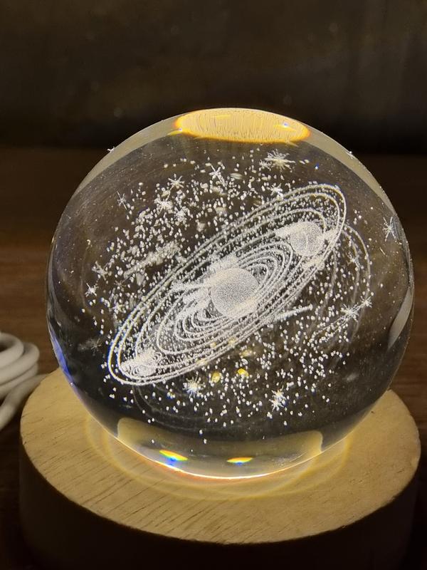 Підсвітка - однотонне тепле світло. Світильник- нічник "Кришталева Куля" виконаний з екологічних матеріалів - дерева та скла. Всередині скляної кулі нанесено лазерне гравіювання у вигляді Сонячної системи. 3D нічник має розміри: - Діаметр кулі: 8 см; - Висота підставки: 2 см. Працює світильник від USB-шнура. Нічник скляна куля відмінно підійде для дитячої кімнати, спальні чи кабінету. Він успішно виконує свою основну функцію – створює м'яке розсіяне світло. Декоративний міні світильник "Сонячна система" - чудовий подарунок на день Народження, Новий Рік, новосілля: близьким людям, начальнику, другові, колезі по роботі.