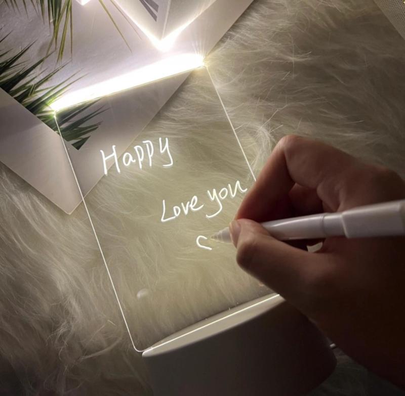 Спецификация: Название: светодиодная акриловая ночная доска заметок Материал: акрил + АБС Напруга: 5 В Мощность: 4 Вт Тип питания: USB Базовый размер: 95*40 мм Световой поток: 100 лм Светлый цвет: теплый Функции: - Высококачественный легкий материал, низкое энергопотребление, энергосбережение, обеспечивающий длительный срок службы. -питание от USB-кабеля, который можно подключить к компьютеру или домашнему адаптеру, что позволяет экономить энергию и защищать окружающую среду.