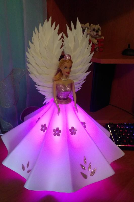 Світильник у вигляді ляльки зроблений з ізолону на заводському плафоні. В комплекті світлодіодна rgb лампочка 5 Вт на 16 відтінків з пультом дистанційного керування. Крила і бант знімні, можна міняти місцями. Додаткові характеристики: Призначення: Для дівчаток Тип цоколя: E27 (Стандарт) Матеріал плафона, підвісок: Пластик Тип: Нічник