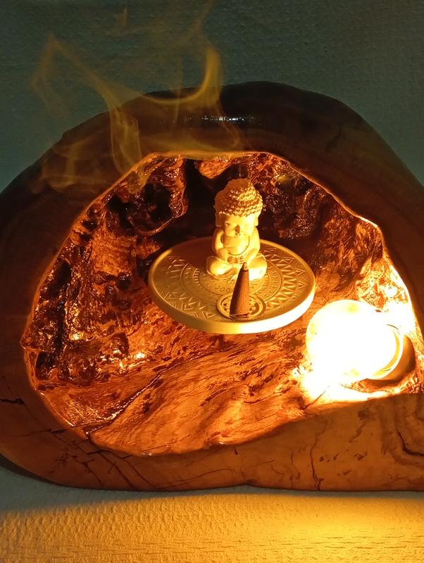 Природна печера-світильник з деревини дуба. Всередині залишені всі утворення, що дуже нагадують фактуру справжньої кам′яної печери. Мандала з гіпсу, на якій розташовано зйомну фігурку Будди ніби парить в повітрі. На ній зручно розміщати аромаконуси для медитації чи свічки. Загальні розміри 39*24*28 Електрофурнітура білого кольору, патрон під стандартну лампочку Е27 (в даному виробі застосували лампочку з м′яким помаранчевим світлом)