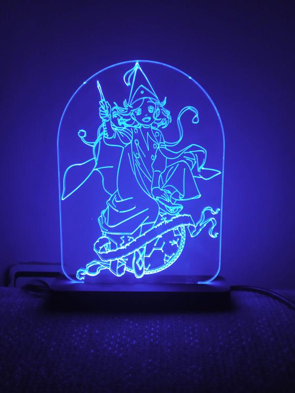 Світильник-нічник працює від мережі 220V Довжина шнура - 1м 10см За допомогою пульта управління можна обирати кольори і режими освітлення. Всього 16 кольорів. Підставка - 15см-3,5см Скляна пластина - приблизно 15-20 см, в залежності від сюжету може бути ширшою чи вищою. Світильник довговічний, простий у використанні, потребує мінімум енергії. Добре виглядає у дитячій кімнаті.