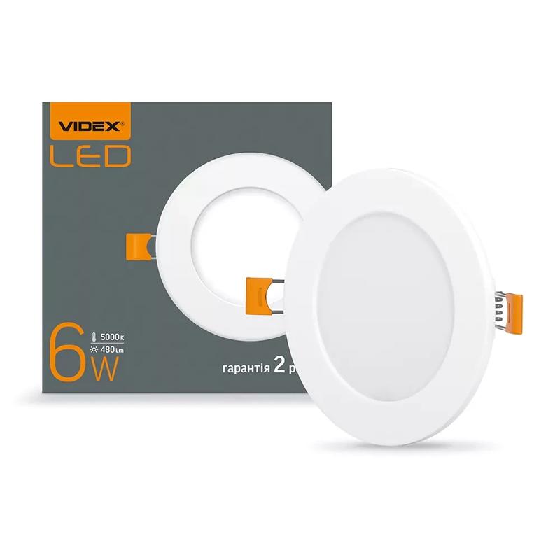 LED світильник вбудований круглий VIDEX 6W 5000K Світильник, що вбудовується VIDEX - є джерелом якісного освітлення і споживає набагато менше електроенергії. Він не нагрівається і тому чудово поєднується з підвісними або натяжними стелями, а монтаж не викличе труднощів навіть у непрофесіонала. Має сучасний дизайн. Усі світильники відрізняються своєю екологічністю. Регульований механізм кріплення забезпечує максимальну зручність при монтажі світильника. Світильники поставляються у зібраному вигляді, разом із скобами кріплення. Готові до встановлення прямо із упаковки. Його розміри становлять лише 118x16,5мм. Діаметр врізного отвору 94мм. Після монтажу не потребує обслуговування протягом усього періоду експлуатації. Світильник має світловіддачу – 80лм/Вт. Сумарна сила світлового потоку становить 480 лм. Відтворює приємне рівномірне світло. Під час роботи світильника немає мерехтіння, цим знижує навантаження на зір. Колірна температура – 5000К (максимально наближений до денного світла). Кут розсіювання світла – 120°, що дозволяє якісно висвітлити приміщення. Стійкий до великої кількості включень та вимкнень (100000). Ресурс роботи – 30000 годин. Служитиме довго, що підтверджується гарантією – 2 роки. При виготовленні використовуються лише безпечні матеріали. При підключенні безпосередньо до мережі забезпечить стабільну роботу під час перепадів напруги. Робоча напруга 185-265В.