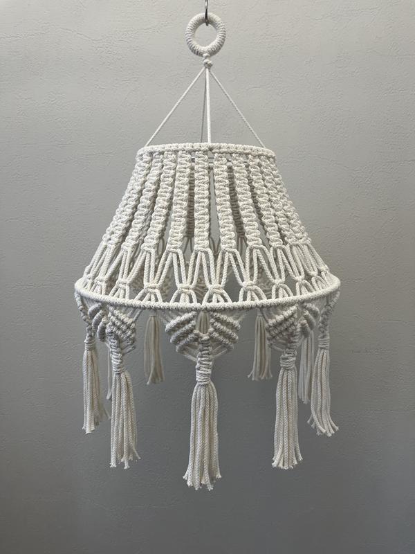Абажур макраме, висота 40 см, діаметр верхнього кільця 20 см, нижнє -40 см. Колір айворі. Абажур може бути виконаний в інших кольорах та розмірах,