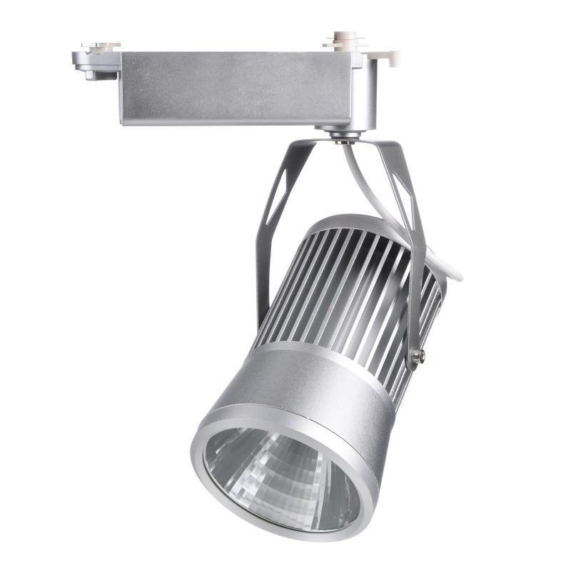 Трековий світлодіодний світильник LED-406/20W COB SL. Трек-система складається зі струмопровідних треків, трансформатора, сполучних елементів та спеціальних світильників. Цей освітлювальний прилад виготовлений з металу і скла, пофарбований в сріблястий колір, завдяки якому він виглядає надзвичайно стильно. Компактна конструкція корпусу дозволяє кріпити світильник до шинопроводу в приміщенні будь-якого стилю. Світильник обладнаний одним світлодіодом типу COB, що має велику щільність випромінювання, тобто випромінює більше світла при меншій площі самого світильника. Світлодіод випромінює рівне холодне біле світло зі світловим потоком 1200 лм. Потужність складає 20 Вт, розрахований він для роботи в мережі змінного струму з номінальною напругою 220 В. Особливістю світильника є те, що він обладнаний поворотним механізмом, за допомогою якого ви зможете регулювати кут його нахилу, а, відповідно, і площу освітлення. Купуючи даний світлодіодний трековий світильник, ви автоматично забезпечуєте приміщення якісним світлом на довгі роки.