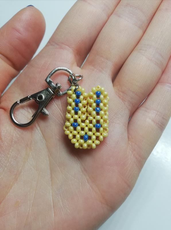 Колір на вибір - сірий, білий, чорний, жовто-блакитний. Бісерний брелок із сплетеною об'ємною фігуркою зайчика. Розмір фігурки 2.5 см, довжина разом з карабіном 7 см. Упаковка - подарункова коробочка.