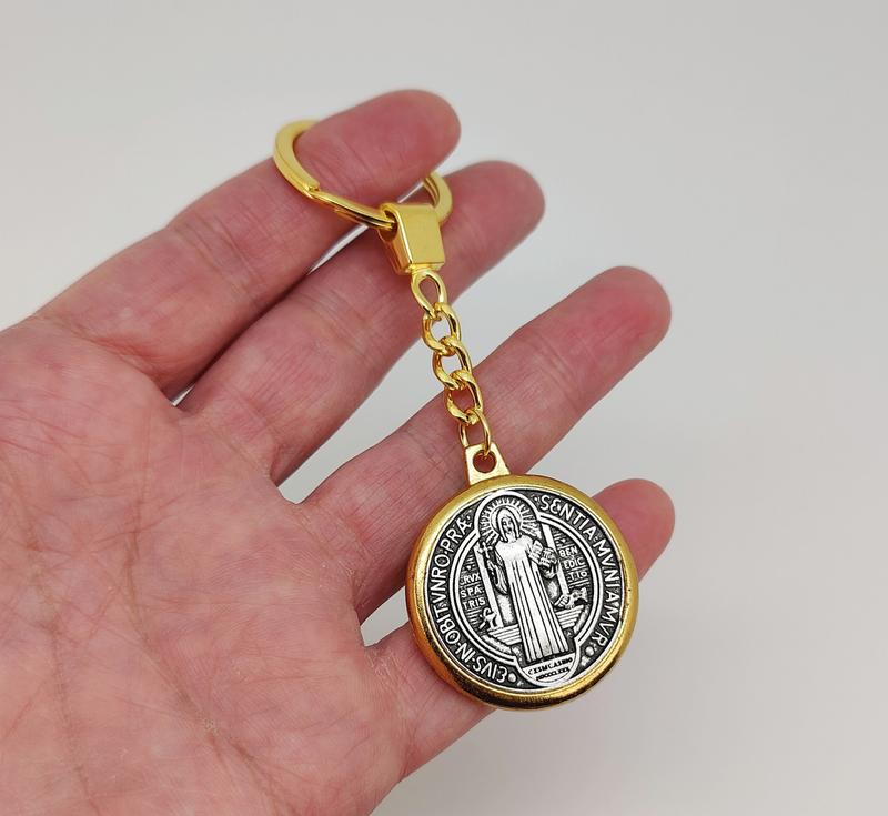 Брелок для ключей "Св. Бенедикт". Металл, размеры: длина общая 10,50 см., диаметр 3,30 см., толщина 0,56 см., вес 25,42 грм., цвет - золото/серебро.
