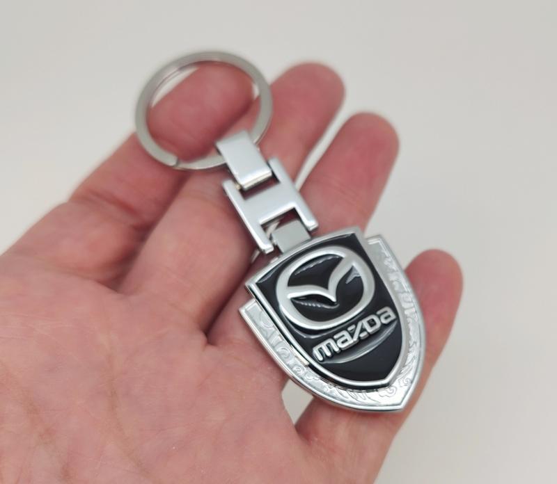 Брелок на ключи "Мазда". Металл/эмаль черная, размеры: длина общая 9,30 см., ширина 3,40 см., толщина 0,50 см., вес 31.50 грм., эмблема авто нанесена с обеих сторон.