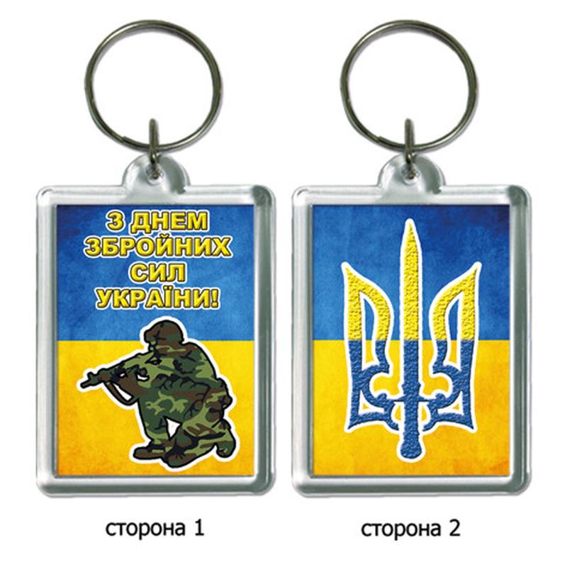 Брелок сувенирный акриловый двусторонний "З Днем Збройних Сил України" с тризубом. Размер картинки - 35х50 мм. Фурнитура - кольцо с переходником.
