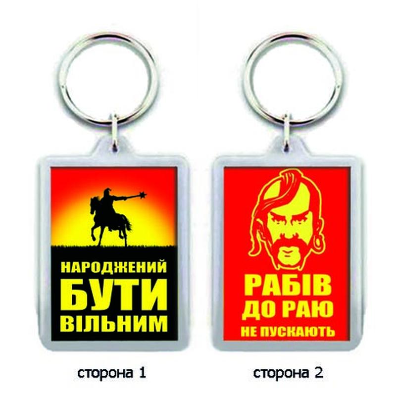 Брелок сувенірний акриловий двосторонній на подарунок до Дня Захисника України "Народжений бути вільним. Рабів до раю не пускають". Розмір картинки - 35х50 мм. Фурнітура - кільце з перехідником.