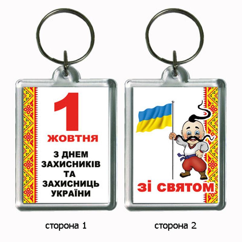 Брелок сувенірний акриловий двосторонній "Зі святому 1 жовтня - З Днем Захисника Украіни" з козаком. Розмір картинки - 35х50 мм. Фурнітура - кільце з перехідником.