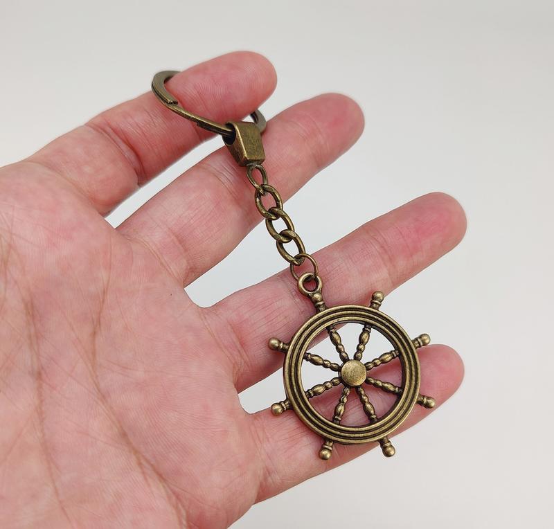 Брелок "Штурвал". Метал, розміри: загальна довжина брелока 11,00 см, ширина 4,00 см, товщина 0,20 см, вага 11.55 гм, колір — бронза.