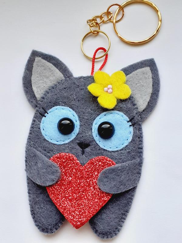 Сувенір ручної роботи, подарунок до Дня закоханих, валентинка. Можна створити в інших кольорах, звертайтесь. Розміри: 7 х 5 см + ланцюжок і кільце 6 см. Матеріали: фетр, акриловий декор, металева фурнітура. Передплата на карту, Безпечна оплата, відправка Укрпоштою, НП.