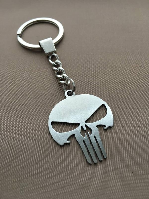 Брелок для ключів Каратель Матеріал - нержавіюча сталь Товщина - 1 мм Розмір - 40х30 мм Загальна довжина близько 10 см Відправлю будь-яким перевізником та способом оплати