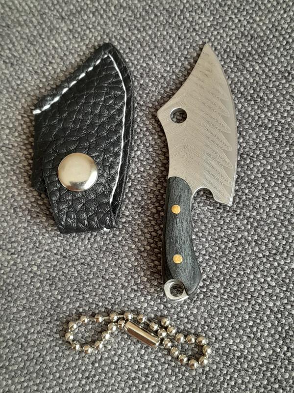 Размер: 7×2 см Материалы: металл, древесина (руковья), чехол из экокожи Компактный и стильный аксессуар в виде мини-ножа. Идеально подходит в качестве брелока для ключей или подарка для ценителей ножей и ручной работы. В комплекте идет чехол из экокожи и металлическая подвеска-цепочка.