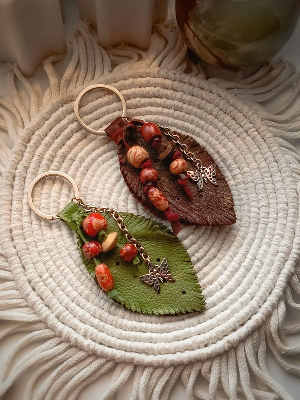 Якісні шкіряні брелоки у вигляді листя, оздоблені дерев'яними розписними намистинами і металевою фурнітурою. Такі аксесуари можна носити як на зв'язці ключів, так і як підріску до рюкзака або сумки. Ціна вказана за 1 брелок