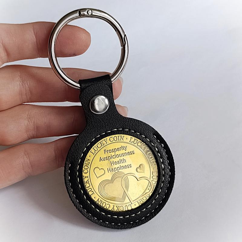 Підходить до монет діаметром до 40 мм. Матеріал: шкірозамінник. Колір: чорний. Повна довжина брелока: 10.7 см.