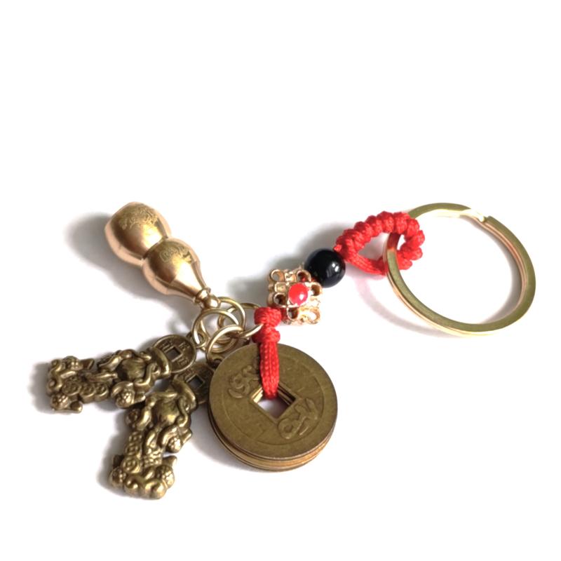 Полная длина брелока: 9.5 см. Материал: металл. На брелоке собраны 4 элемента подвески - ключ с изображением 2-х рыбок, связка из 5-ти монет, дракон пиксиуи с монетой во рту и тыква с возможностью наполнять содержимым. Пиксиу - мифическое существо из китайской мифологии, часто изображается как крылатый лев или дракон, способные привлекать богатство и защищать от злых духов. Это существо считается одним из девяти мальчиков Дракона и обладает силой отгонять негативную энергию и привлекать удачу. Тыква является символом здоровья, долголетия и защиты от негативных энергий. Тыква-горлянка также ассоциируется с удачей и процветанием. Связка с 5 китайскими монетами часто ассоциируется с фен-шуй и привлечением богатства и благополучия. Такое украшение может быть использовано как предохраняющее от негативного воздействия, а также для привлечения удачи и улучшения жизненной энергии