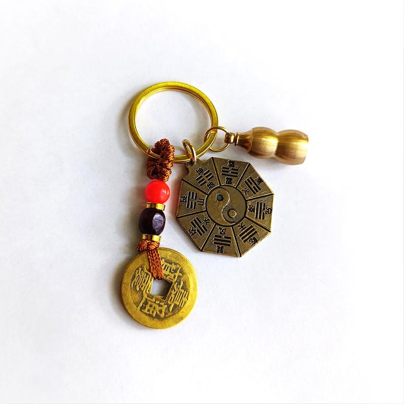 Полная длина брелока: 9.5 см. Материал: металл. На брелоке собраны 3 элемента подвески - связка из 5-ти монет, тыква с возможностью наполнять содержимым и символ Багуа. Тыква является символом здоровья, долголетия и защиты от негативных энергий. Тыква-горлянка также ассоциируется с удачей и процветанием. Связка с 5 китайскими монетами часто ассоциируется с фен-шуй и привлечением богатства и благополучия. Такое украшение может быть использовано как предохраняющее от негативного воздействия, а также для привлечения удачи и улучшения жизненной энергии. Багуа - талисман, который приносит успех и защиту, особенно в практике фен-шуй, в свою очередь, является восьмиугольником, символизирующим восемь триграмм, каждая из которых связана с определенным аспектом жизни и энергии.