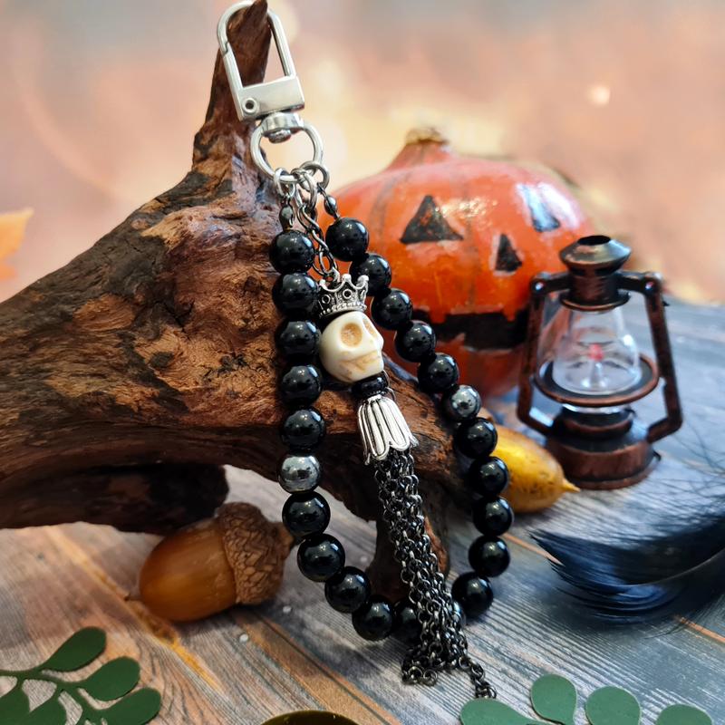 🖤☠️ Підвіска-брелок "Хелловін" з натуральним каменем чорний онікс, говліт та гематит для ключів, на сумочку або косметичку. Розмір: довжина з поворотним карабіном з біжутерного сплаву 12 см, намистини 8 мм. Склад: натуральний камінь чорний онікс, говліт, гематит, біжутерний сплав. Це відмінний аксесуар чи подарунок на Хелловін, ідеальне доповнення до сумки чи ключів.