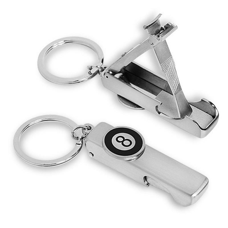 Этот брелок для ключей одновременно является компактным комплектом инструментов, в которых зачастую неожиданно возникает необходимость. Здесь и открывалка для бутылок, и книпсер с пилочкой для ухода за ногтями. Все составляющие брелока металлические, лицевая сторона оформлена диском с изображением бильярдного шара №8 черного цвета. Упакован брелок в прозрачный блистер.