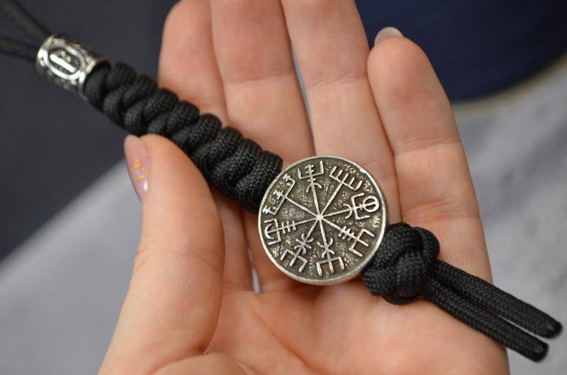 Темляк-брелок из паракорда с руной ансуз (нерж. сталь) и вегвизиром (посеребренная бронза)