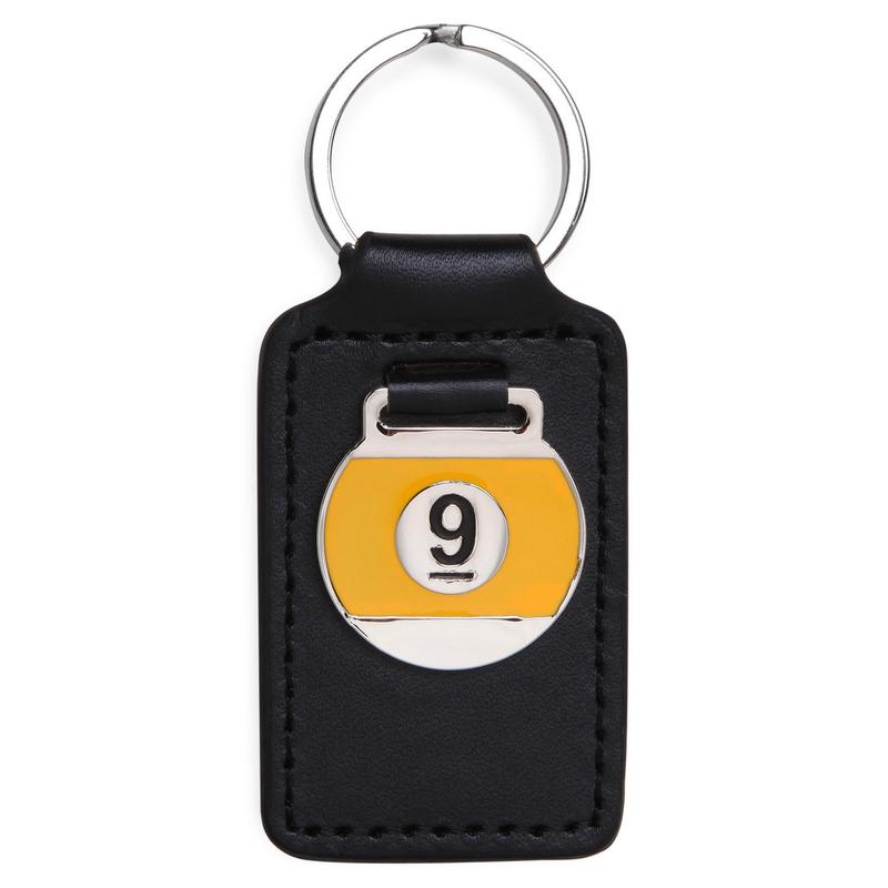 Оригінальний брелок для ключів, виготовлений у формі чорної шкіряної бирки з прикріпленим до неї металевим диском, що імітує жовту більярдну кулю No9. Кільце для ключів з'єднано безпосередньо з биркою, без додаткових елементів кріплення. Брелок легкий — зручно носити в кишені — і яскравий, тому нескладно буде розшукати ключі, прикріплені до нього, серед безлічі дрібних речей на столі або в сумці. Упакований у прозорий блістер із картонною підкладкою для збереження форми паковання. Гарний недорогий подарунок або приємний знак уваги для друга або колеги, який захоплюється більярдом.