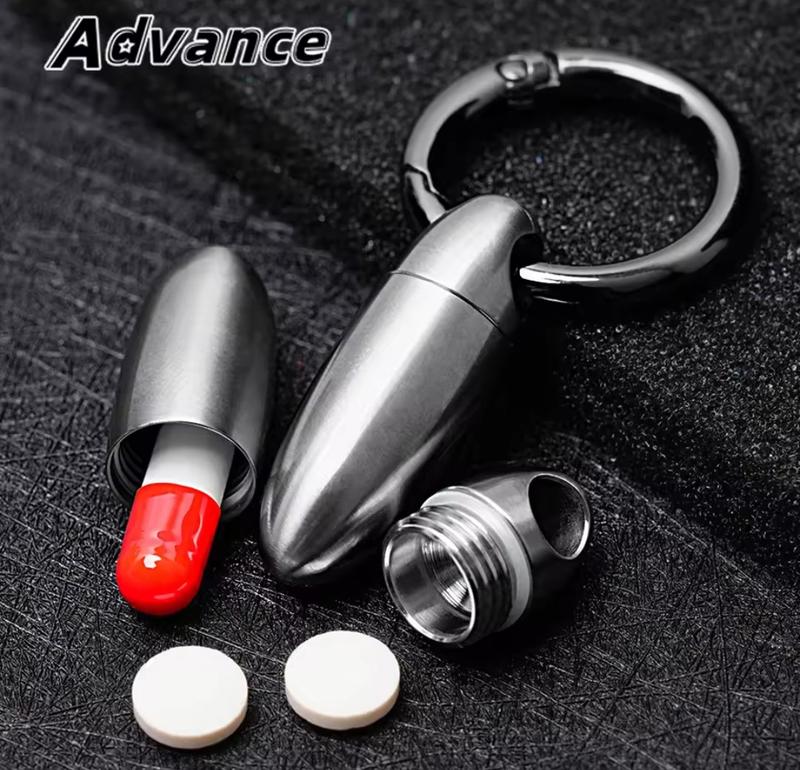 Капсула-брелок із титанового сплаву. Розміри: загальна висота 3,50 см, діаметр капсули 1,20 см, вага 11.00 гм, діаметр кільця 2,70 см, капсула герметично закривається, у комплекті дві додаткові ущільнювальні гумки.