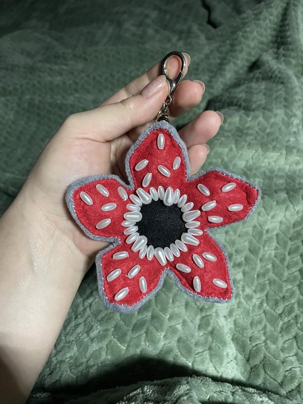 Брелок у вигляді голови Демогоргона . Розмір 10*10 . Має застібку карабін , може чіплятися на рюкзак, пенал, сумку , куртку чи ключі . Пелюстки тримають форму і можуть згинатися , зуби бусини якісно пришиті вручну.
