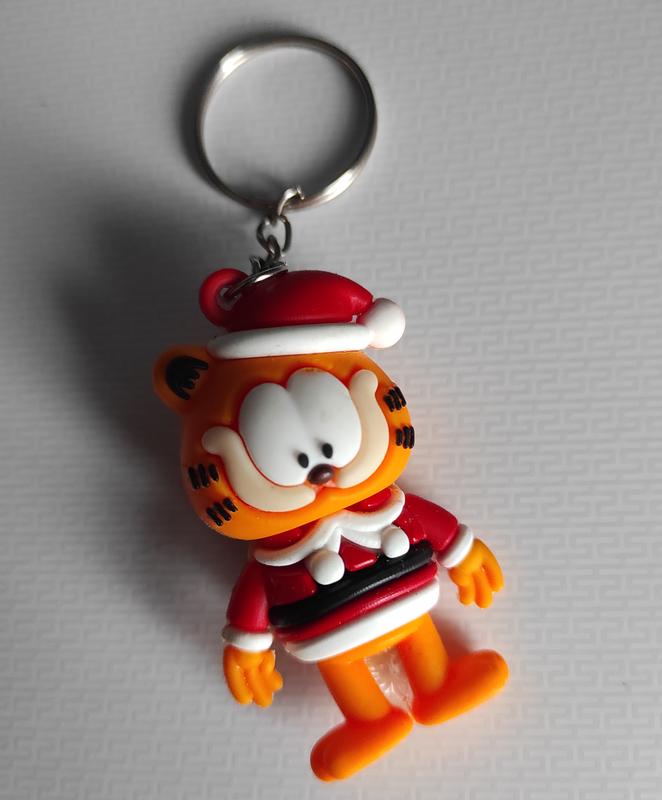 Брелок у формі персонажа Гарфілда в костюмі Санта-Клауса. Виготовлений із полімерного матеріалу. Підходить як подарунок або прикрасу для ключів, сумки або рюкзака. Виготовлений у яскравих жовтогарячому, червоному та білому кольорах.