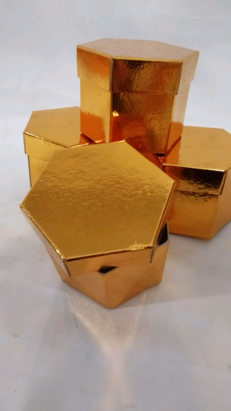 Тип упаковки: Коробки Кілька примірників у наявності Коробочка для подарунка виконана з картону і фольги (золотого кольору ) методом тиснення. Подарункова коробка має шестигранну форму і складається з двох частин, нижній та верхній. Розміри коробочки : Висота -6 см. Діаметр - 7 см. Ціна за 1 штуку. Відправка в зібраному вигляді.