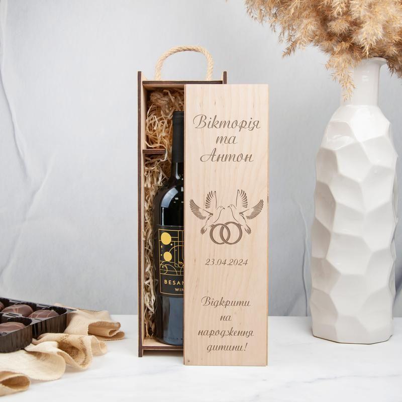 Коробка для шампанського "Дзвіночки" порадує своїх майбутніх власників не тільки зміст (до речі, крім шампанського, в неї з легкістю поміститися пляшка вина або, наприклад, віскі), а й оригінальним гравіюванням, і, звичайно, якістю. Ця дивовижна коробка стане чудовим подарунком батькам, друзям чи колегам. Коробка з дерева – чудовий варіант упакування для пляшки вина, шампанського, віскі. Завдяки такій коробці з персональним лазерним гравіюванням ваш подарунок зі звичайного перетворитися на справді унікальний! Упакувавши вибраний напій у винну коробку, ваш подарунок виглядатиме солідно та вельми презентабельно. Це ідеальний вибір для новорічного та різдвяного подарунка. З одного боку – вибір презенту стає простим, з іншого – ви робите його особливим. Кожна коробка для вина з написом виконана з натуральної високоякісної березової фанери завтовшки 6 мм. Зверніть увагу на наявність роздільника для більш надійного утримання пляшки. ПЛЯШКА У КОМПЛЕКТ НЕ ВХОДИТЬ. Колір деревини та гравіювання може трохи відрізнятися від зображення на сайті, оскільки кожен товар унікальний, а передача кольору залежить від налаштувань вашого монітора або телефону. Якщо ви хочете додати персональне гравіювання на коробку, просто напишіть нам про це. Характеристики: зовнішній розмір: 37 х 10,5 х 10,5 см внутрішній розмір: 33 х 9 х 9 см матеріал: березова фанера роздільник зверху на відстані 9,4 см комплектація: коробка для вина, дерев'яна стружка Товар виготовляється на замовлення